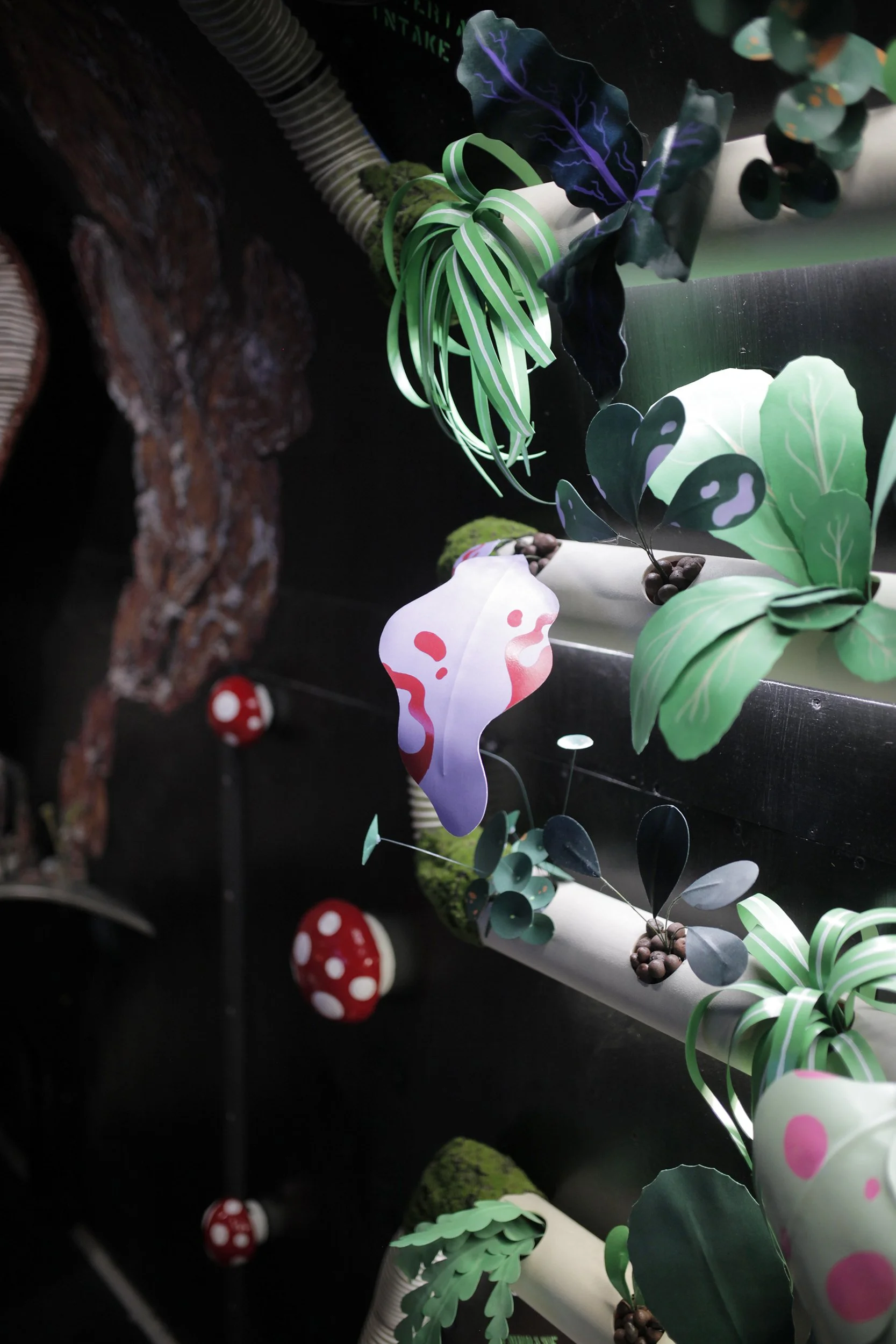 The hydroponic garden is a love letter to growing and loving the food you eat. A personal look into my own childhood, where my parents grew their own veggies in the backyard, and would always ask us to cut up fruits after a meal for dessert. I wanted to invite the viewer to imagine how nature can continue to thrive, even on an abandoned ship. I see this work as a reminder of how living things will morph and change to survive, and how beauty can be found in things that are forgotten. Visitors can interact with the art by lifting the mushroom caps. Each one has a different fruit or vegetable growing inside!